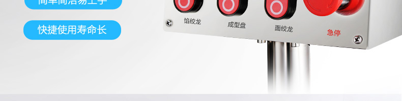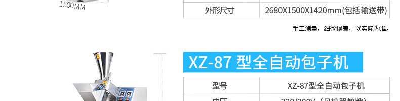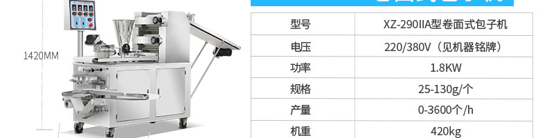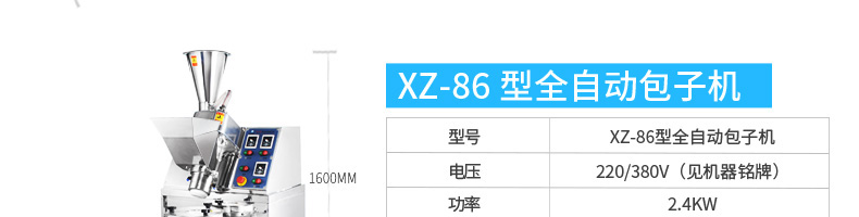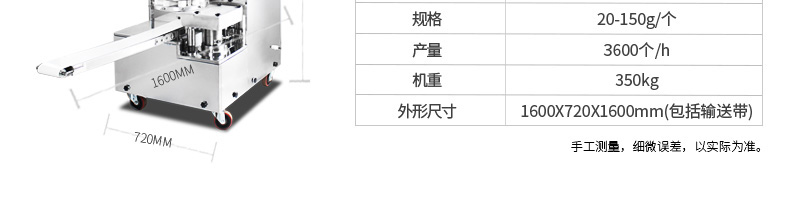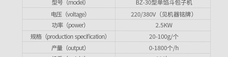 名稱BZ-30型單餡斗包子機 電源220/380V(見機器名牌) 功率2.5kw 產量1800個/小時 尺寸1440*680*1470mm 重量300kg 規格25-100克/個 其他