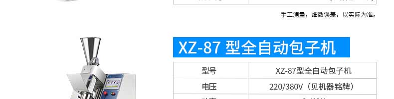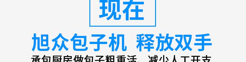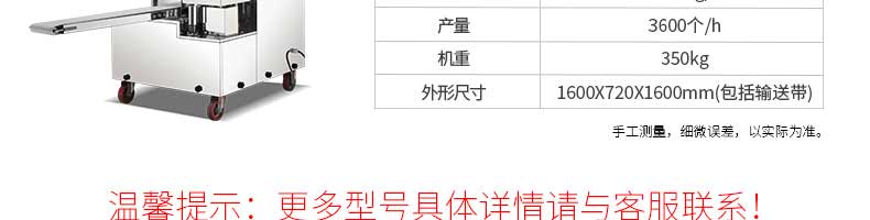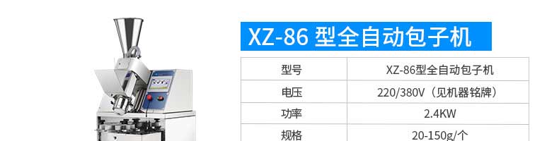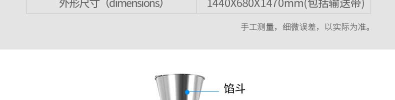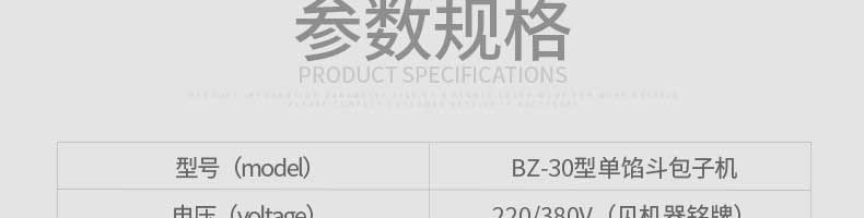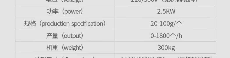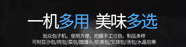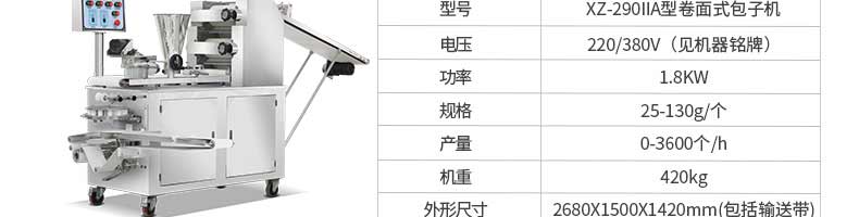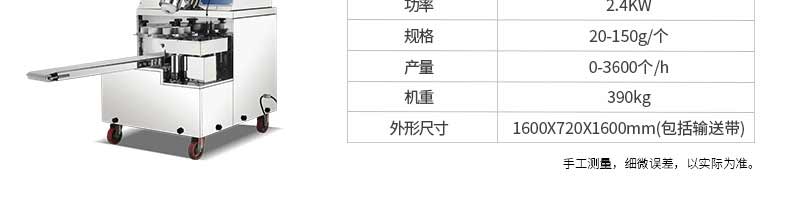 名稱旭眾30單餡斗包子機 電源220/380V(見機器名牌) 功率2.5kw 產量0-1800個/小時 尺寸1440*680*1420mm(包括輸送帶) 重量300KG 規格20-100克/個 其他