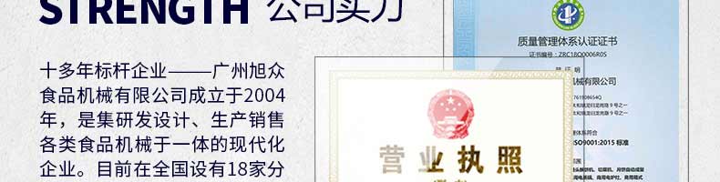 廣州旭眾食品機械有限公司是一家集科研開發,生產設計,營銷服務為一體的現代化生產企業。現代化生產車間,精湛制造技術,所產機械歷經市場重重考驗,不斷贏得海內外客戶的贊譽。