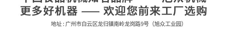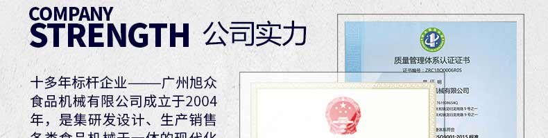 廣州旭眾食品機械有限公司是一家集科研開發,生產設計,營銷服務為一體的現代化生產企業。現代化生產車間,精湛制造技術,所產機械歷經市場重重考驗,不斷贏得海內外客戶的贊譽。