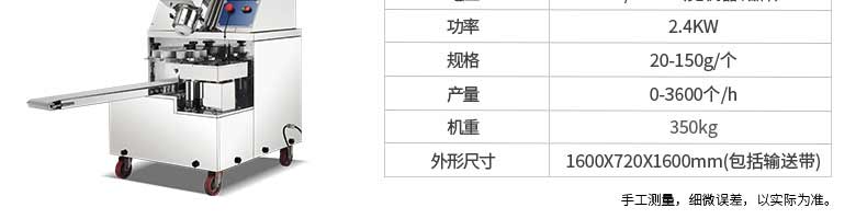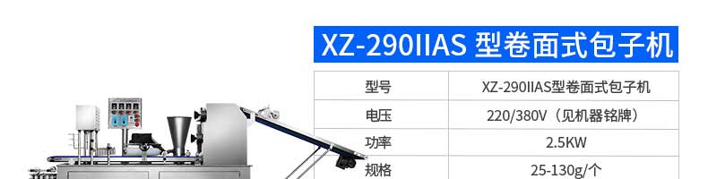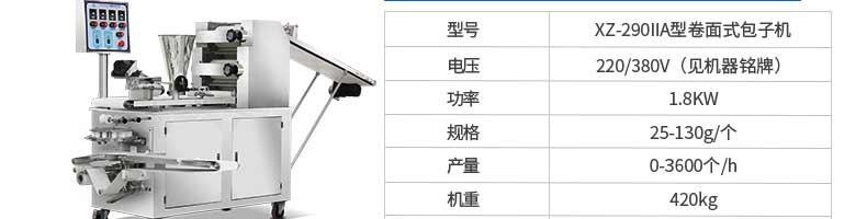 名稱XZ-290AS智能型卷面包子機 電源220/380v 功率4.05kw 產量0-3600個/h 尺寸3280*1500*1420mm 重量480kg 規格 其他