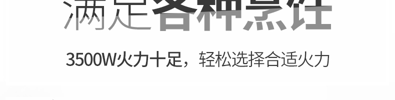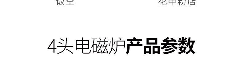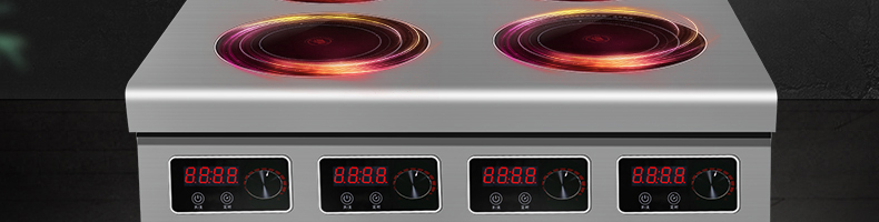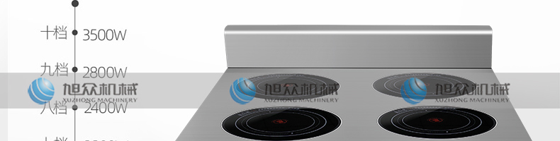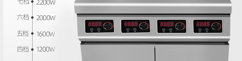 四頭柜式電磁爐,10檔調節,滿足各種烹飪。3500W火力十足,輕松選擇合適火力。同時工作互不干擾單獨磁爐控制面板,設置不同大小檔數,同時工作,互不干擾。