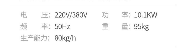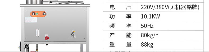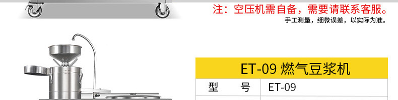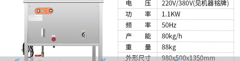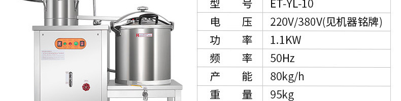 名稱ET-YL-09壓力電熱豆漿機 電源220V/380V 功率10.1KW 產量80kg/h 尺寸980X500X1350mm 重量95kg 規格聯系銷售員 其他頻率:50Hz