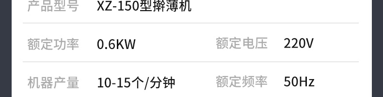 名稱XZ-150型搟薄機 電源220V 功率0.6KW 產量10-15個/分鐘 尺寸1720X800X1050mm 重量請咨詢銷售員 規格50-170克/個 其他額定頻率:50Hz