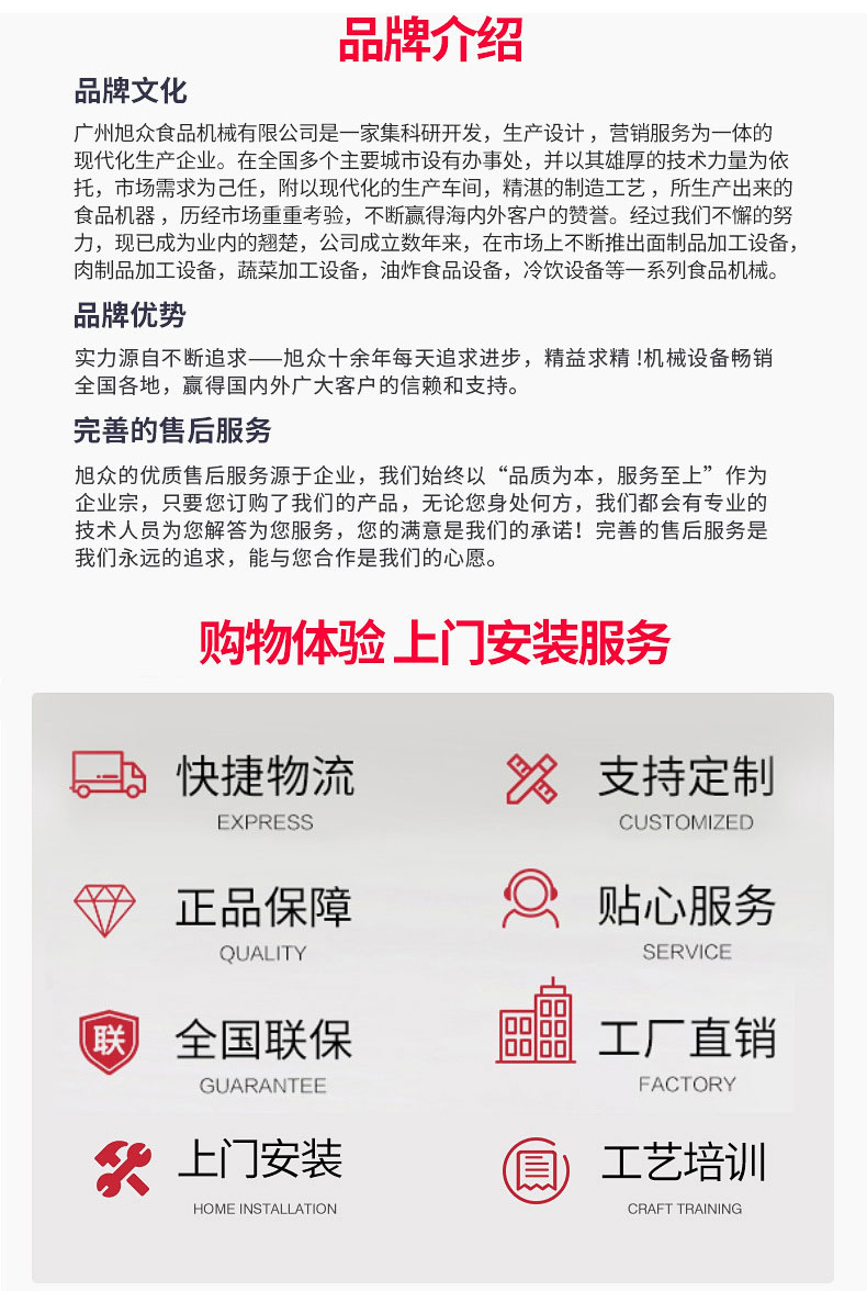 廣州旭眾食品機(jī)械有限公司是一家集科研開發(fā),生產(chǎn)設(shè)計(jì),營銷服務(wù)為一體的現(xiàn)代化生產(chǎn)企業(yè)?,F(xiàn)代化生產(chǎn)車間,精湛制造技術(shù),所產(chǎn)機(jī)械歷經(jīng)市場重重考驗(yàn),不斷贏得海內(nèi)外客戶的贊譽(yù)。