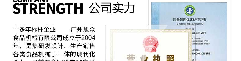 廣州旭眾食品機械有限公司是一家集科研開發,生產設計,營銷服務為一體的現代化生產企業。現代化生產車間,精湛制造技術,所產機械歷經市場重重考驗,不斷贏得海內外客戶的贊譽。
