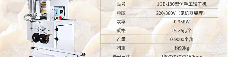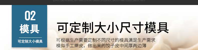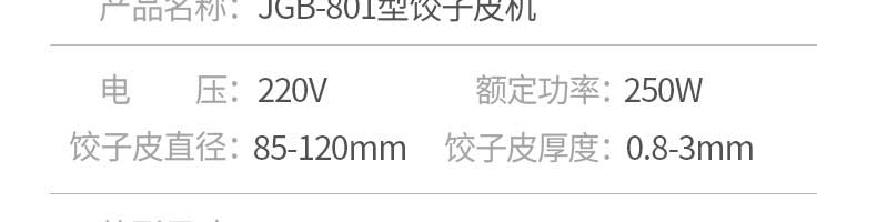 名稱801II餃子皮機 電源220V 功率250W 產量各款有不同,聯系銷售員 尺寸650X380X750mm 重量各款有不同,聯系銷售員 規格餃子皮直徑:85-120mm餃子皮厚度:0.8-3mm 其他