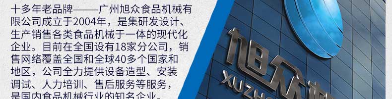 廣州旭眾食品機械有限公司是一家集科研開發,生產設計,營銷服務為一體的現代化生產企業。現代化生產車間,精湛制造技術,所產機械歷經市場重重考驗,不斷贏得海內外客戶的贊譽。