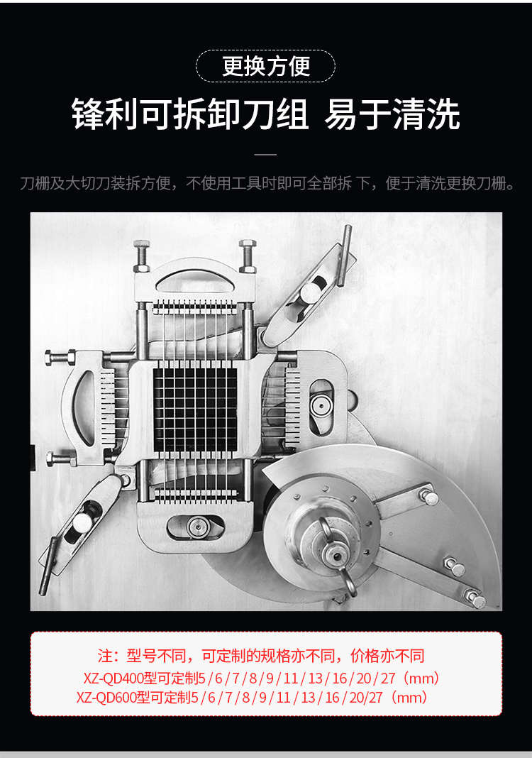 XZ-QD400切丁機(jī),替您排憂解難全自動(dòng)商用切丁機(jī)切片、切絲、切丁,功能強(qiáng)大,滿足您的使用需求。多功能&實(shí)用人即可操作,切出自己想要的規(guī)格,滿足商用多種需求。