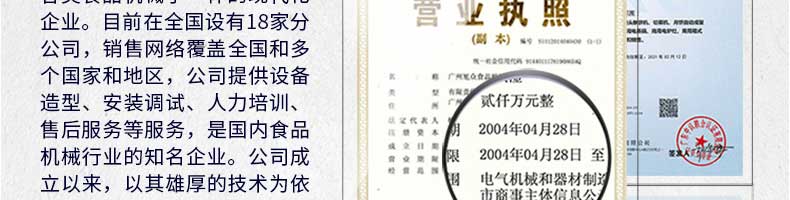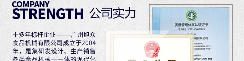 廣州旭眾食品機械有限公司是一家集科研開發,生產設計,營銷服務為一體的現代化生產企業。現代化生產車間,精湛制造技術,所產機械歷經市場重重考驗,不斷贏得海內外客戶的贊譽。