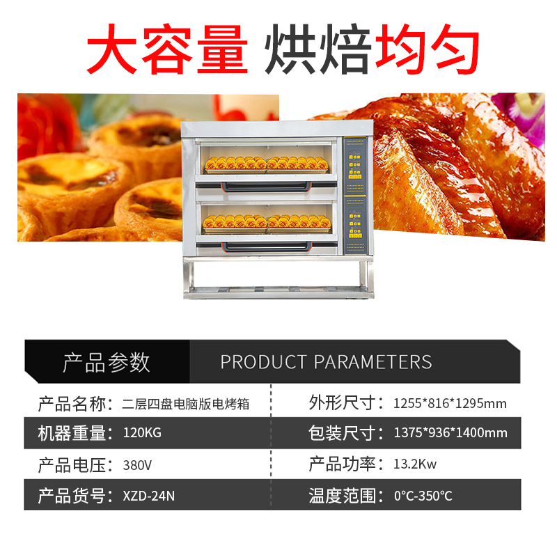 名稱二層四盤電腦版電烤箱 電源380V 功率13.2Kw 產量 尺寸1255*816*1295mm 重量120KG 規格兩層四盤 其他