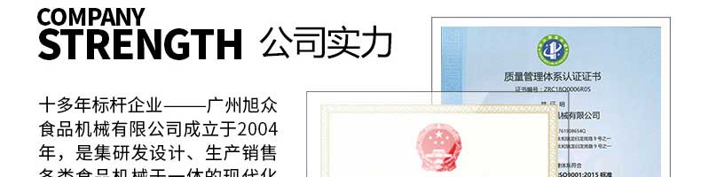 廣州旭眾食品機械有限公司是一家集科研開發,生產設計,營銷服務為一體的現代化生產企業。現代化生產車間,精湛制造技術,所產機械歷經市場重重考驗,不斷贏得海內外客戶的贊譽。