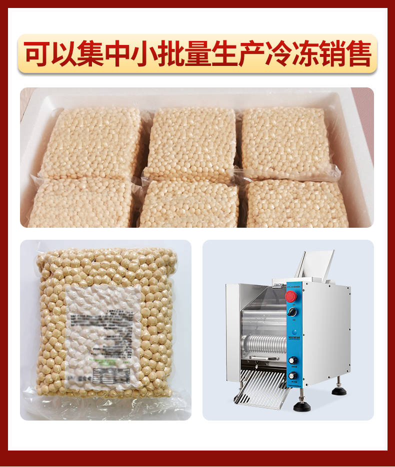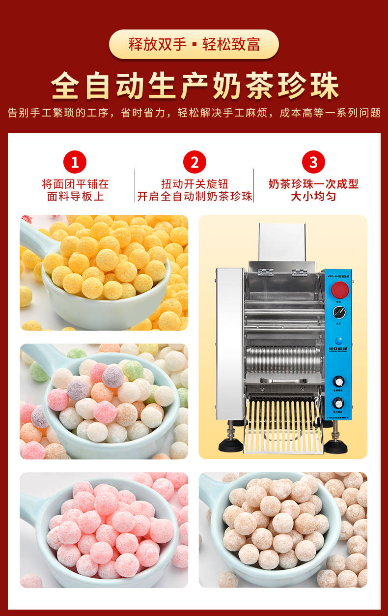 VFD-900珍珠奶茶機,奶茶店、甜品店可用。可生產奶茶珍珠,果蔬圓子,無餡湯圓,水晶湯圓,各種芋圓。不占空間、體積小、重量輕,桌面上的小奶茶珍珠機。告別手工繁瑣的工序,省時省力,輕松解決手工麻煩,成本高等一系列問題