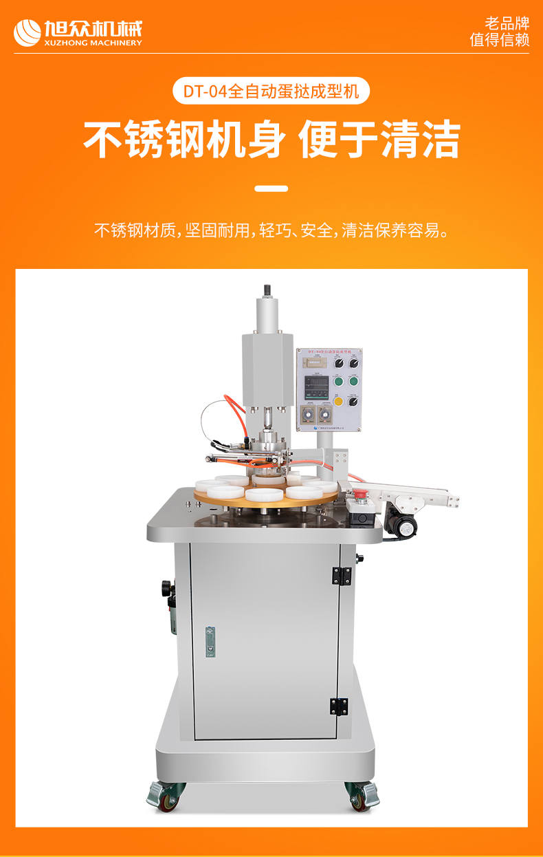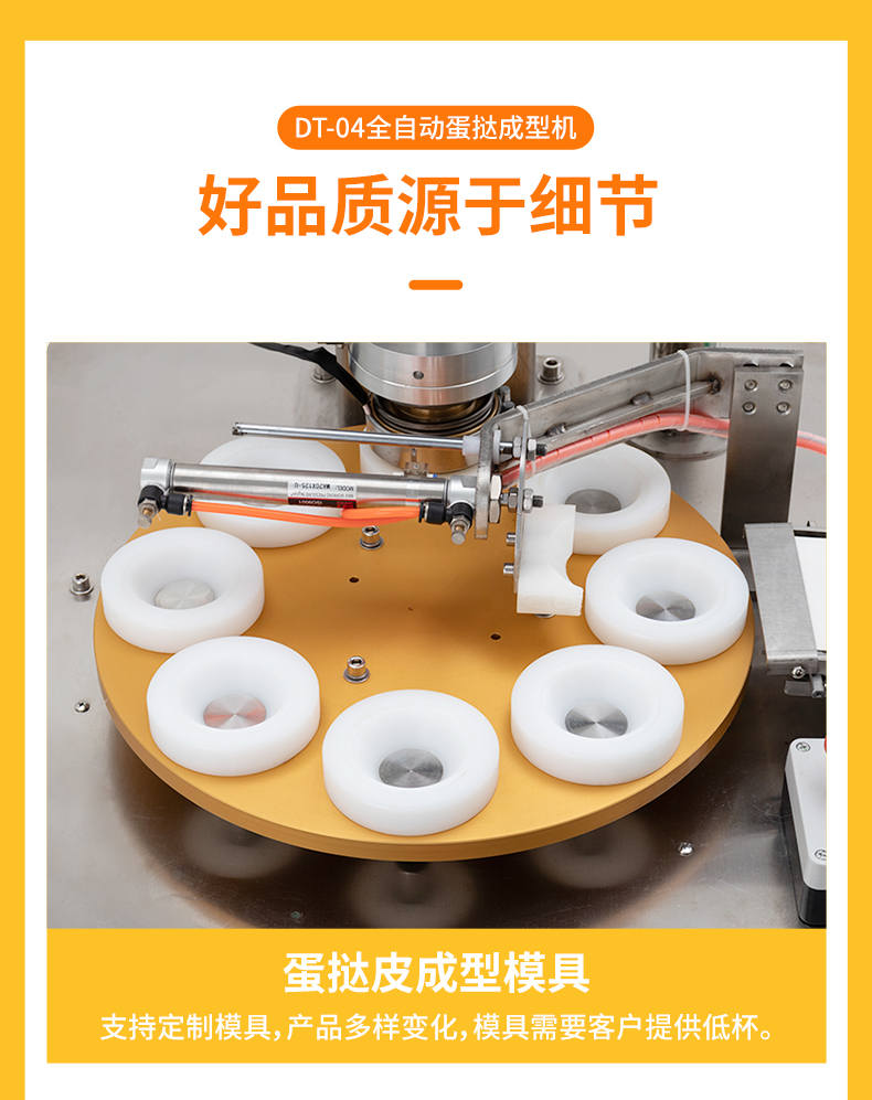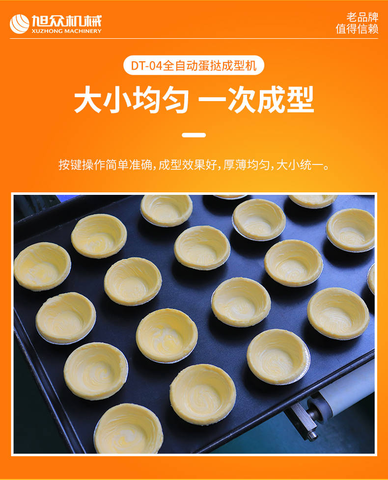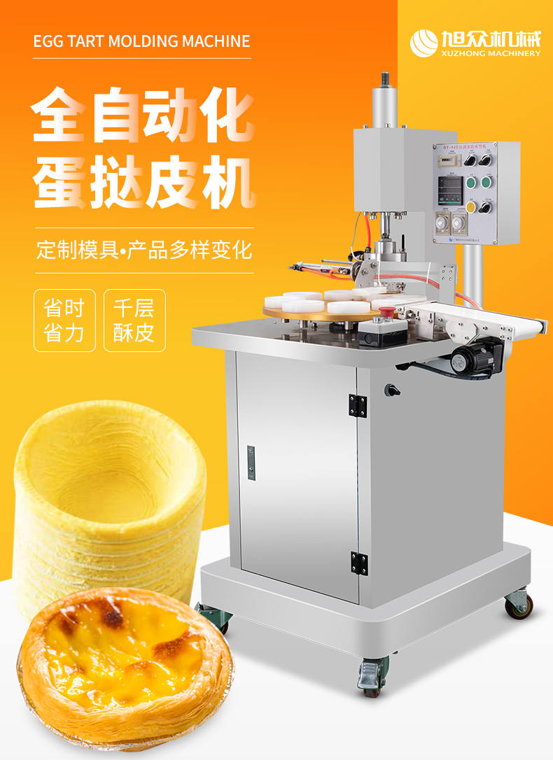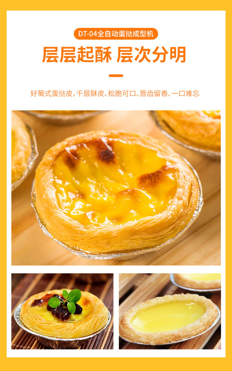 DT-04全自動蛋撻成型機,2-3秒快速成型。該機應用于傳統蛋撻、葡式蛋撻及其它須印型之產品突破傳統用手捏,采用微電子控制成型,一個2-3秒,高效率。大小均勻一次成型按鍵操作簡單準確,成型效果好,厚薄均勻,大小統-。層層起酥層次分明好葡式蛋撻皮,千層酥皮、松脆可口、唇齒留香、一口難忘。