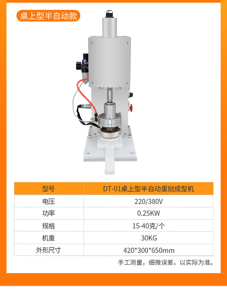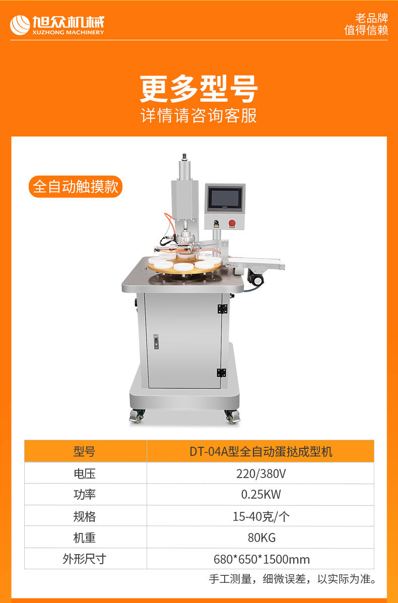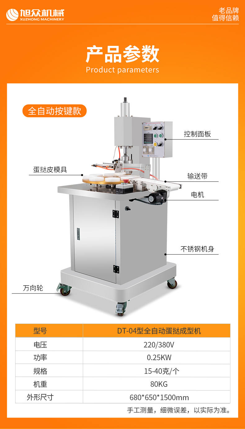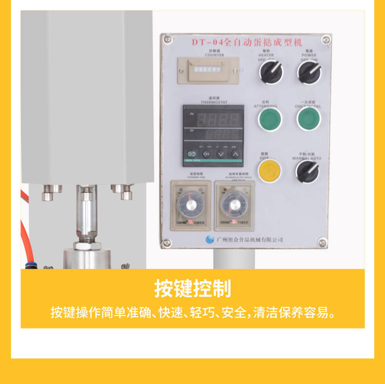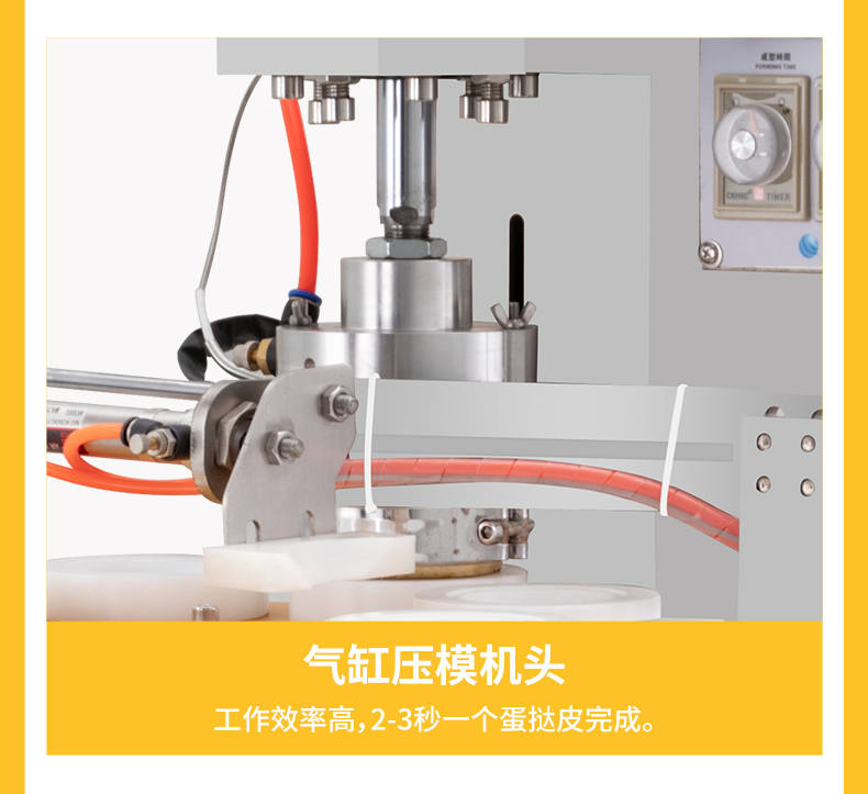 DT-04全自動蛋撻成型機,2-3秒快速成型。該機應用于傳統蛋撻、葡式蛋撻及其它須印型之產品突破傳統用手捏,采用微電子控制成型,一個2-3秒,高效率。大小均勻一次成型按鍵操作簡單準確,成型效果好,厚薄均勻,大小統-。層層起酥層次分明好葡式蛋撻皮,千層酥皮、松脆可口、唇齒留香、一口難忘。