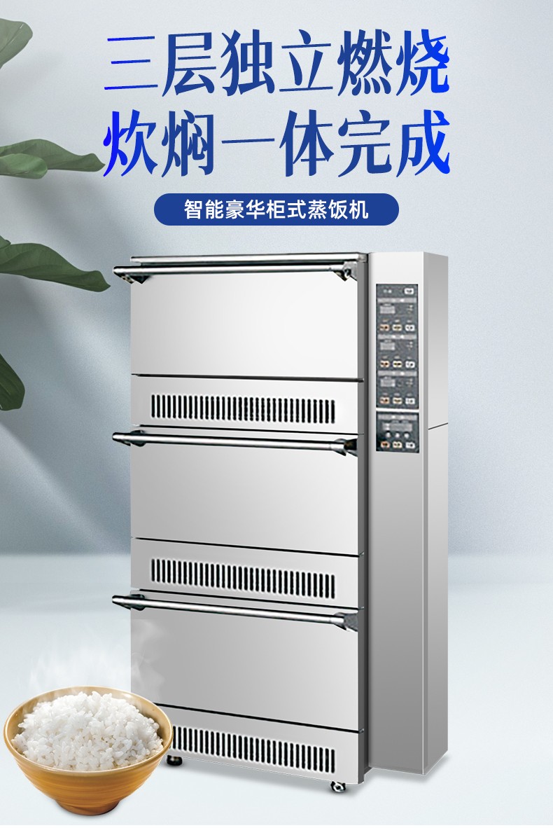 立式米飯機,主要結構:主要由全不銹鋼柜體、上下三層結構加原鋁鎂合金模鑄鍋體、微電腦自動控制系統燃燒系統、熄火保護系統等組成。適用對象:主要用于生產加工高品質米飯的壽司店、高端酒店西餐廚房、茶餐廳以及高端的快餐門店等