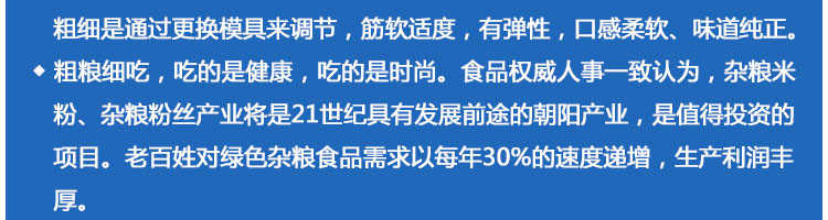 SZ-400多功能米粉機,生產(chǎn)多樣性可生產(chǎn)米粉、米線、粉絲、粉條、、年糕、玉米面條、各種雜糧粉絲、各種面條、雜糧面條、彩色面條以及以紅薯、玉米、大豆、蠶豆等制成淀粉為原料的等多種食品而且每種食品厚薄、粗細等規(guī)格可根據(jù)需要任意調(diào)整。