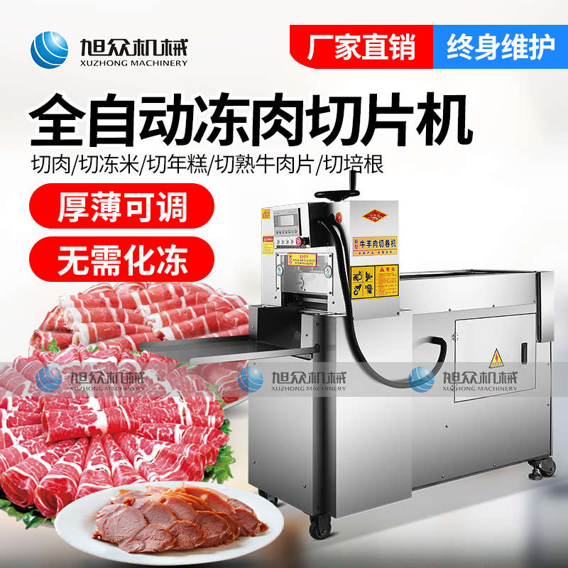 XZ-羊肉切片機,一次成片切片神器,全自動凍肉數控切片機,肉片自動打卷|厚薄可調|無需化凍|一機多用。你還用手工切片嗎?旭眾全自動羊肉切片機一機多用,輕松解決切割問題。