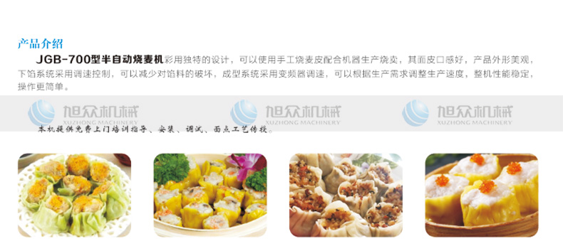 JGB-700燒麥機(jī),采用特的設(shè)計,可以使用手工燒麥皮配合機(jī)器生產(chǎn)燒賣,其面皮口感好,產(chǎn)品外形美觀下餡系統(tǒng)采用調(diào)速控制,可以減少對餡料的破壞,成型系統(tǒng)呆用變頻器調(diào)速,可以根據(jù)生產(chǎn)需求調(diào)整生產(chǎn)速度,整機(jī)性能穩(wěn)定操作更簡單