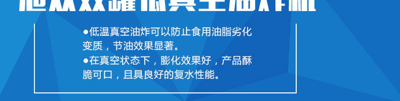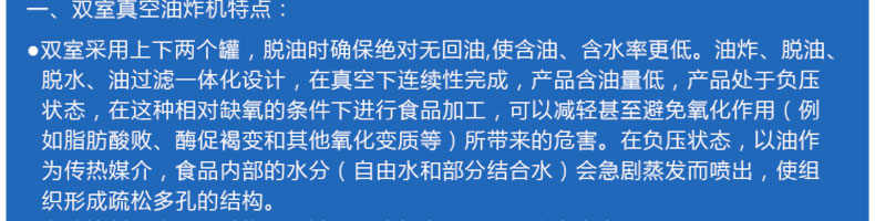 zk-700雙室低溫真空油炸機,適用于水果類、蔬菜類、干果類、水產(chǎn)品機畜禽肉類等。自動控制溫度,無過熱、無過壓,確保產(chǎn)品質(zhì)量和安全生產(chǎn)。